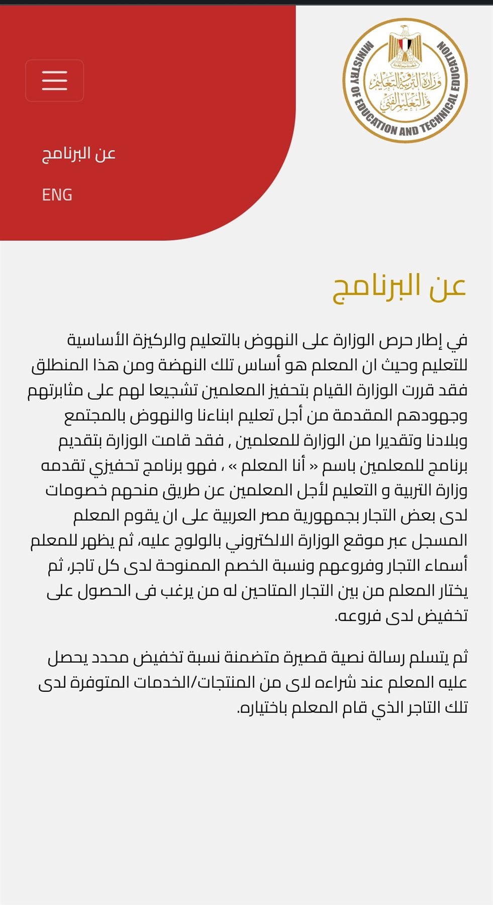 وأشارت وزارة التربية والتعليم إلى أن أهداف مشروع أنا المعلم هو التأكيد على دور المعلم وأهميته، ومن خلال الدخول على المنصة يمكن للمعلم استكشاف كل العروض المتاحة ويتم اختيار العرض المناسب له، وبمجرد اختيار العرض سوف يظهر كلمة “احصل على العرض”، وسيتم تفعيله، ثم يقوم بعد ذلك المعلم بالتوجه إلى الفرع ليحصل على الخصم بإظهار الكود المفعل.