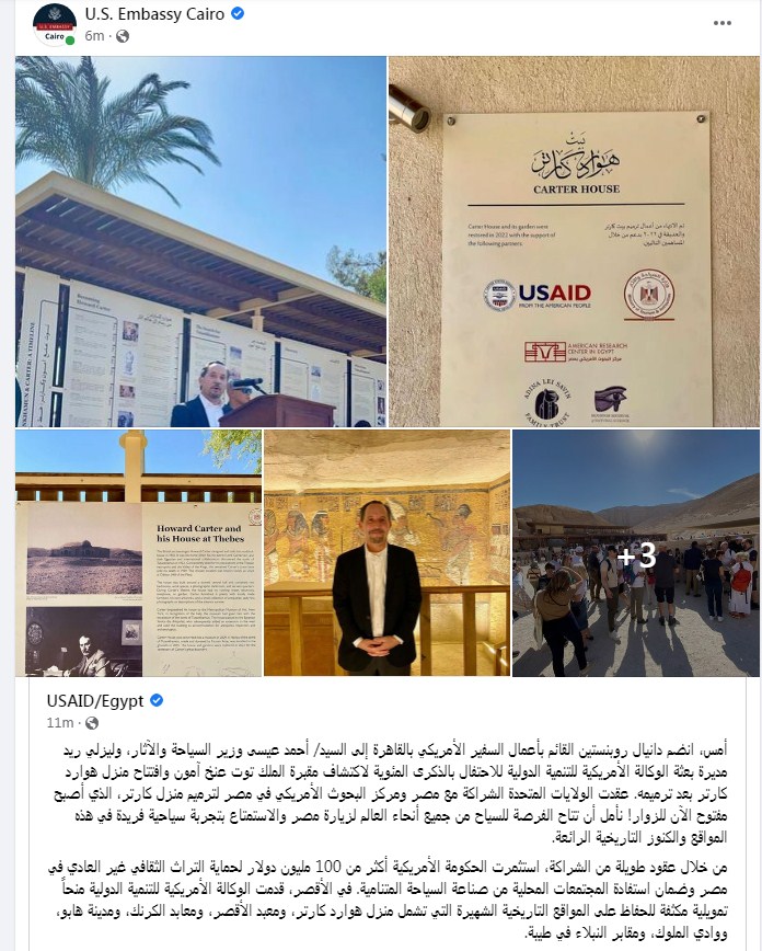 وكتبت الوكالة الأمريكية للتنمية في مصر تدوينة على الفيس بوك "أمس، انضم دانيال روبنستين القائم بأعمال السفير الأمريكي بالقاهرة إلى أحمد عيسى وزير السياحة والآثار، وليزلي ريد مديرة بعثة الوكالة الأمريكية للتنمية الدولية للاحتفال بالذكرى المئوية لاكتشاف مقبرة الملك توت عنخ آمون وافتتاح منزل هوارد كارتر بعد ترمیمه."