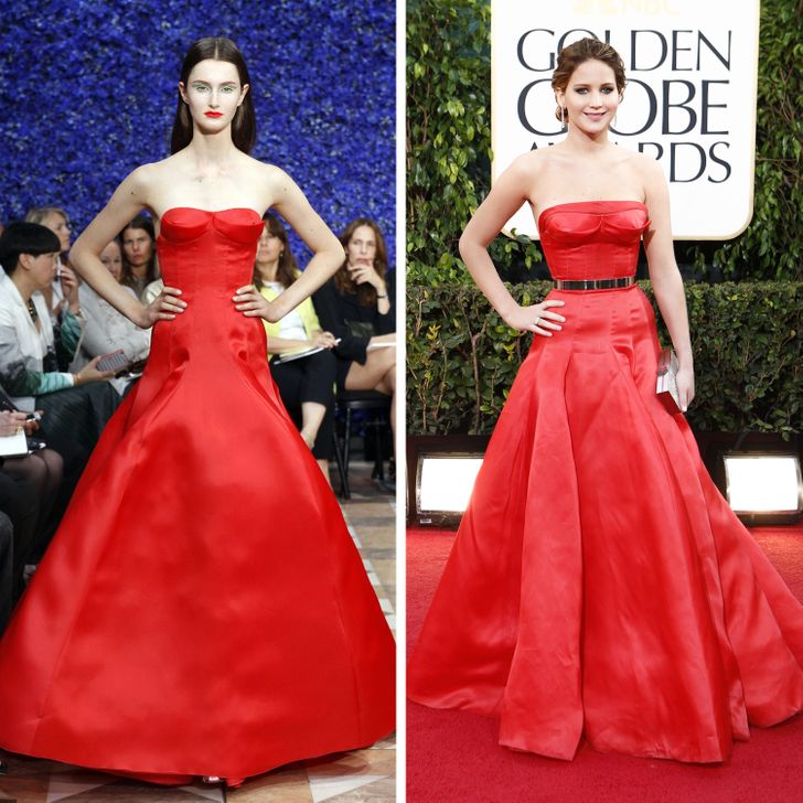 أضافت جينفر لورانس بعض القطع بذكاء لتحسن من مظهر الفستان ليبرز معالم جسدها، ويركز على الإيجابيات التي ترغب بإظهارها مثل الحزام المعدنى، وكذلك تغير شكل الصدر ليناسبها لتضغى بإطلالتها على العارضة التي تبدو عليها قطعة الملابس جامدة.
