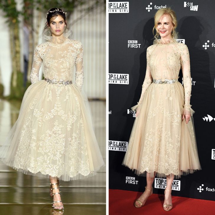 يضيف طول الممثلة الشهيرة لجمالها الفريد الكثير لهذا الفستان حتى أن خصرها يبدو أنحف من العارضة لذلك بدت نيكول بمظهر خلاب، ولكنه وبرغم كل هذه المزايا إلا أنه لم يتغلب على العارضة.