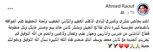 ونشر احمد رؤوف عبر حسابه الشخصي بموقع التواصل الاجتماعي “فيس بوك”:"اتقدم بخالص شكري وتقديري للنادي الاهلي العظيم والكابتن الخطيب ولجنة التخطيط علي الموافقه بانضمامي لمؤسسة كبيره نادي طلائع الجيش".