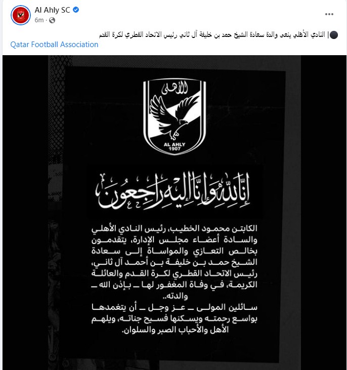 وكتب النادي الأهلي في تدوينة له على الفيس بوك "إنا لله وإنا له راجعون.. الكابتن محمود الخطيب، رئيس النادي الأهلي وأعضاء مجلس الإدارة، يتقدمون بخالص التعازي والمواساة إلي الشيخ حمد بن خليفة بن أحمد آل ثاني، رئيس الاتحاد القطري لكرة القدم، والعائلة الكريمة في وفاة المغفور لها، بإذن الله، والدته"
