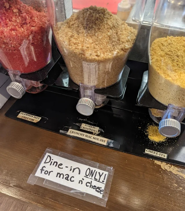 ٨. يقابل معظمنا مع الطعام الذي يحتاج لاضافات أن البائع يضع القليل فقط الذي قد لا يكفي رغباتك لذلك وجد هذا المطعم الذي يقدم الماك آند تشيز الحل لهذه المشكلة حيث أنه وضع عبوات من النكهات التي قد تتوق لها حواس تذوقك والتي تستطيع وضع الكمية التي ترغب بها مثل الشيتوز الحار والثوم والجبنه.