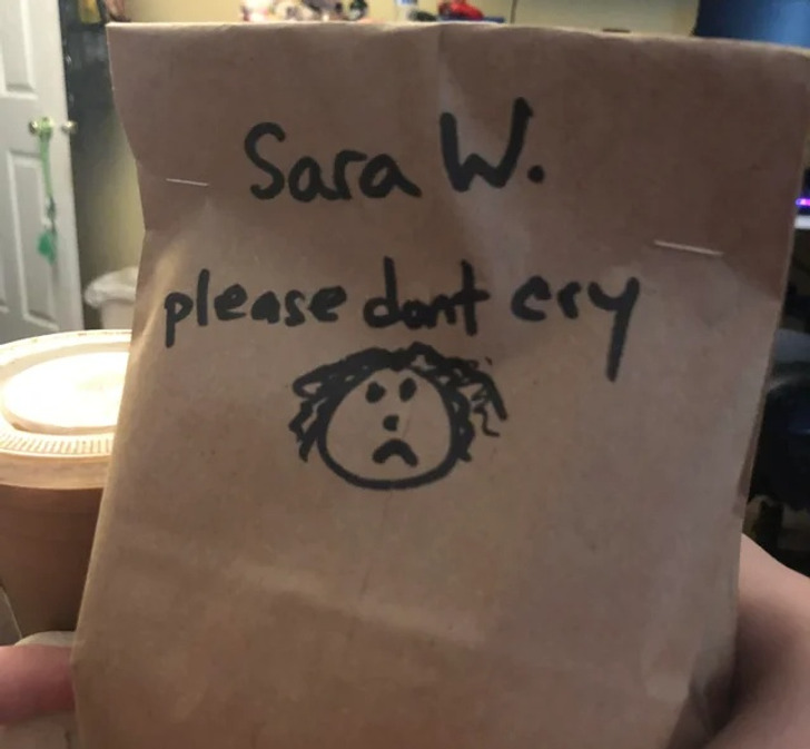 ١٠. طلبت إحدى العميلات من المطعم المجاور لها إلا يضع الكاتشب على طعامها وهددت المطعم بالبكاء إن فعلوا فبعثوا لها بتلك الرسالة على الشنطة "ارجوكي لا تبكي".