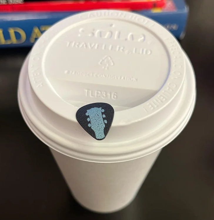 ١٢. استخدم هذه الكافية تقنية ترويج قد تجذب عشاق الموسيقى حيث استخدم ستيكر على شكل ريشة جيتار ليغطي فتحت الشرب بالمشروبات التي يأخذها الزبائن معهم.
