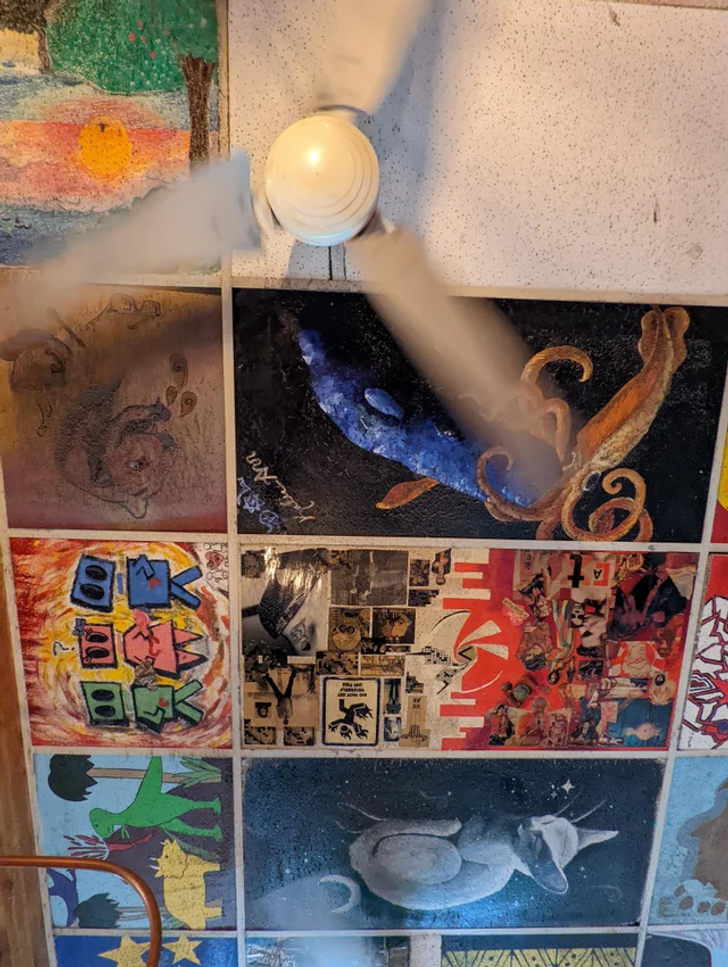 ١٥. اختار هذا المقهى الفن ليكون ما يميزه عن غيره فوضع لوحات متعددة بالسقف الخاص به.