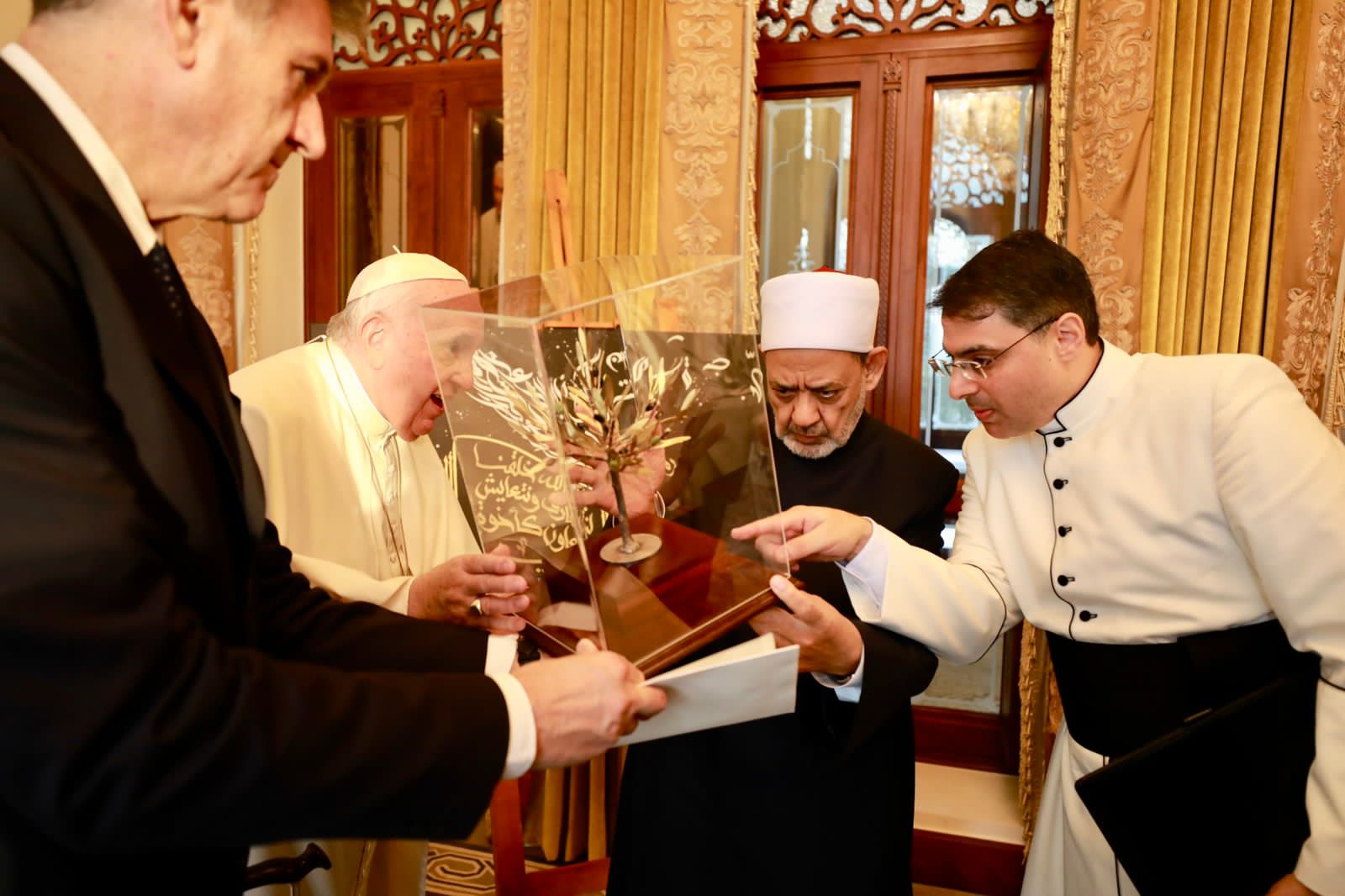 التقى فضيلة الإمام الأكبر أ. د أحمد الطيب، شيخ الأزهر، رئيس مجلس حكماء المسلمين، اليوم، قداسة البابا فرنسيس، بابا الكنيسة الكاثوليكية، في مملكة البحرين، في إطار زيارتهما إلى المملكة لزيارة البلاد والمشاركة في ملتقى البحرين للحوار "الشرق والغرب من أجل التعايش الإنساني".