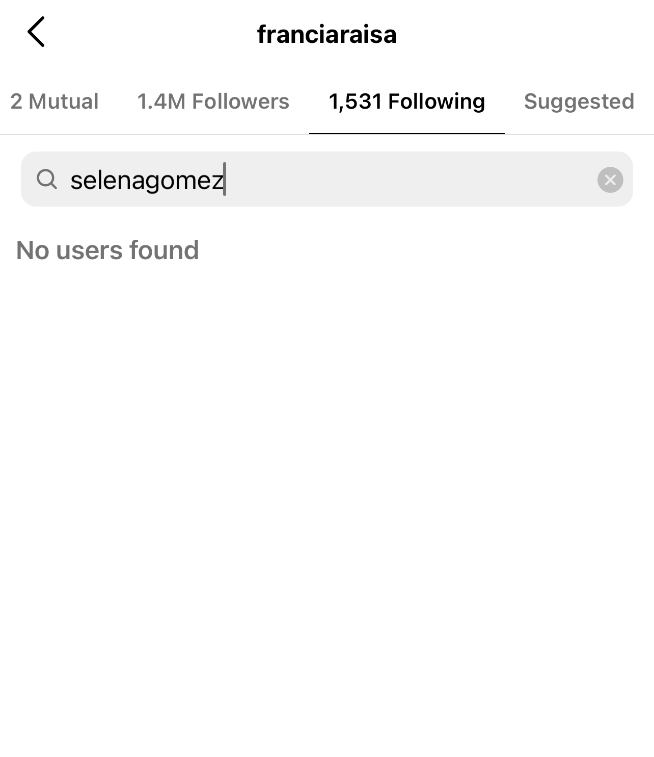 ألغت الممثلة فرانشا رايسا متابعة صديقتها النجمة سيلينا جوميز، على موقع الصور والفيديوهات “إنستجرام”، وذلك بعد أن قالت سيلينا جوميز في تصريحات تلفزيونية، أن تايلور سويفت هي صديقتها الوحيدة من المشاهير.