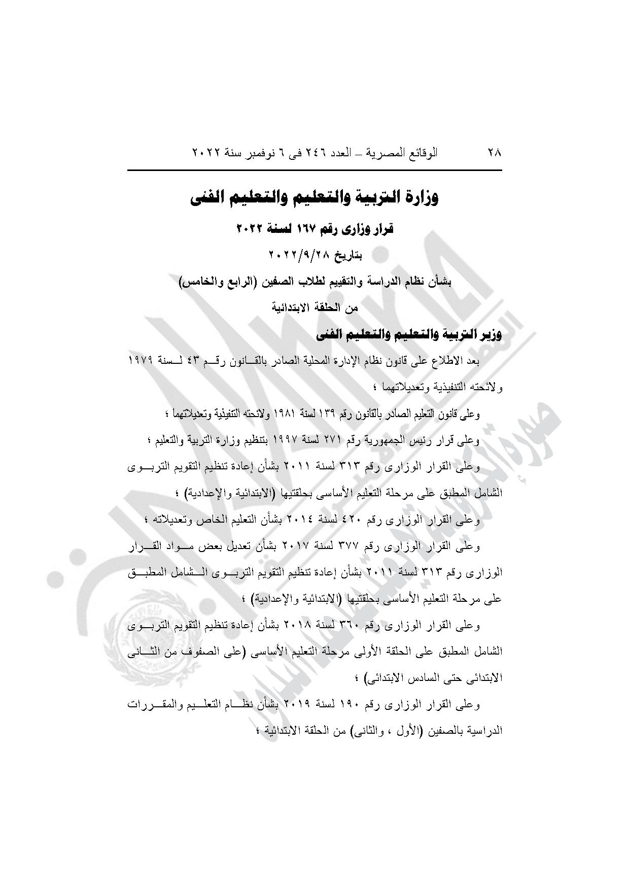 نشرت جريدة الوقائع المصرية في عددها رقم 246، الصادر في 6 نوفمبر 2022، قرارى وزارة التربية والتعليم والتعليم الفني، بشأن نظام الدراسة والتقييم لطلاب الصفين (الرابع والخامس) من الحلقة الابتدائية. ونظام التقييم لصفوف النقل من الصف السادس الابتدائي وحتى الصف الثاني الثانوي العام.