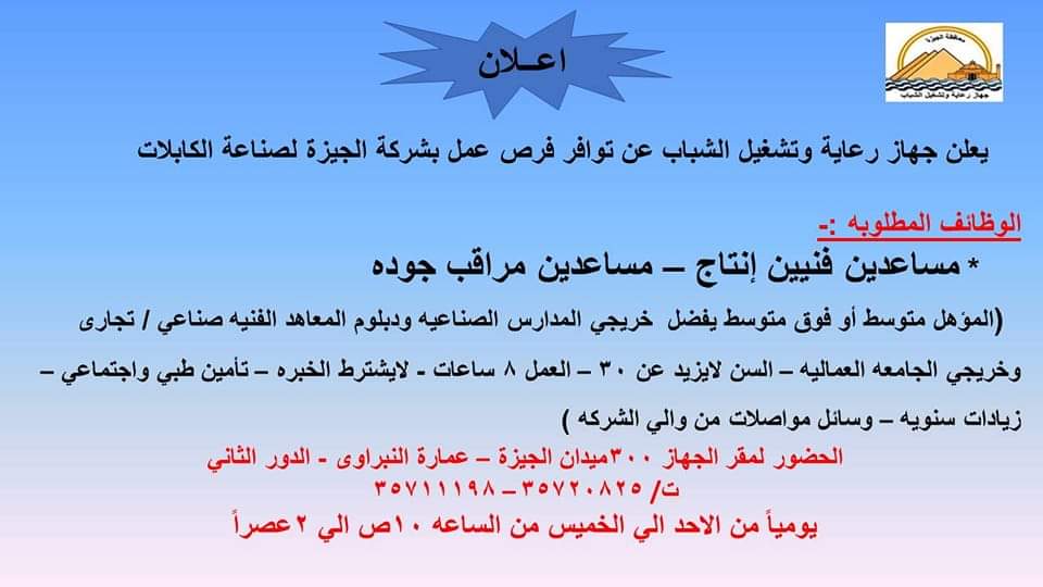 أعلن جهاز تشغيل الشباب بمحافظة الجيزة عن توافر فرصة عمل بشركة الجيزة لصناعة الكابلات، تتمثل في مساعدين فنيين انتاج ومساعدين مراقب جودة.