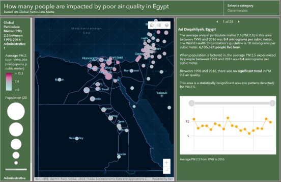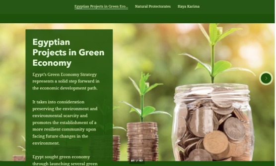 وتسلط الخريطة القصصية الضوء كذلك على استراتيجية الدولة للتحول الى الاقتصاد الأخضر، ثم تعرض جهود الدولة في حل المشكلات البيئية من خلال العديد من المؤشرات في اللوحات المعلوماتية التفاعلية، أبرزها البصمة البيئية لدول العالم، ومعدل جودة الهواء على مستوى الجمهورية فعلى سبيل المثال تظهر الإحصاءات العالمية أن البصمة البيئية في عام 2018 كانت 1.8 وأصبحت 1.78 في عام 2022، وأن ترتيب مصر الحالي في البصمة البيئية للاستهلاك رقم 94 على 151 دولة وأظهرت الإحصاءات أيضًا أن أقل 3 محافظات تأثرًا بجودة الهواء هم أسوان والبحر الأحمر وجنوب سيناء.