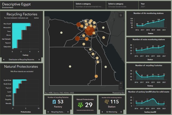 وتضم اللوحات المعلوماتية التفاعلية أيضًا مؤشرات خاصة بنسبة ثاني أكسيد النيتروجين على مستوى العالم، وكذا لوحة معلوماتية من وصف مصر بالمعلومات عن قطاع البيئة، حيث تبين الإحصاءات المحلية على سبيل المثال أن محطات الرصد البيئي بلغ عددها 88 محطة في عام 2016 وأصبحت 115 محطة عام 2021، كما بلغ عدد السيارات المحولة للعمل بالغاز الطبيعي 227 ألف سيارة عام 2016 وأصبحت 339 ألف سيارة عام 2020، وأن عدد أتوبيسات النقل العام بلغ 168 أتوبيس عام 2016 وأصبح 189 أتوبيس عام 2020.