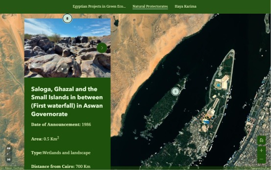 كما تضم المنصة كذلك مشروعات الإدارة المستدامة لمصادر المياه، ومشروع الاستثمار في الطاقة المتجددة، والسندات الخضراء وبورصة الكربون المصرية، والتوجه صوب البناء الأخضر، وأخيرًا المحميات الطبيعية بـ30 محمية طبيعية بطريقة MAP TOUR وتشتمل على عرض لتاريخ إعلانها كمحمية ومساحتها ونوعها وبعدها عن القاهرة، وأخيرًا استعراض مبادرة حياة كريمة من حيث أهدافها ومراحلها والفئات المستهدفة والأطراف الفاعلة في المبادرة.
