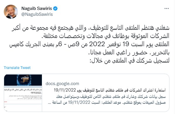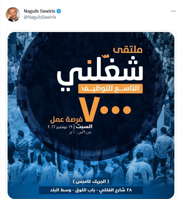 وكتب نجيب ساويرس تغريدة على تويتر قال فيها: "شغلني هتنظم الملتقى التاسع للتوظيف، واللي هيجتمع فيه مجموعة من أكبر الشركات الموثوقة بوظائف في مجالات وتخصصات مختلفة.. الملتقى يوم السبت 19 نوفمبر 2022 من 9 ص - 6 م بمبنى الجريك كامپس بالتحرير. حضور راغبي العمل مجانا. لتسجيل شركتك في الملتقى من خلال الرابط: "