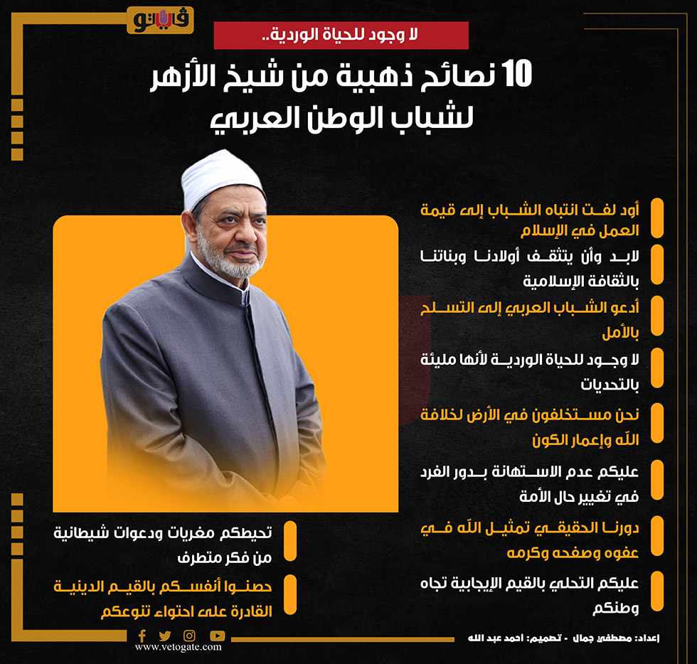 لا وجود للحياة الوردية..10 نصائح ذهبية من شيخ الأزهر لشباب الوطن العربي | إنفوجراف الأحد 06/نوفمبر/2022 - 09:31 م 11/6/2022 9:31:05 PM الدكتور أحمد الطيب - شيخ الأزهر الشريف مصطفى جمال شارك طباعة 18 حجم الخط شارك طباعة الشباب العربي شيخ الأزهر شباب الوطن العربي الثقافة الاسلامية