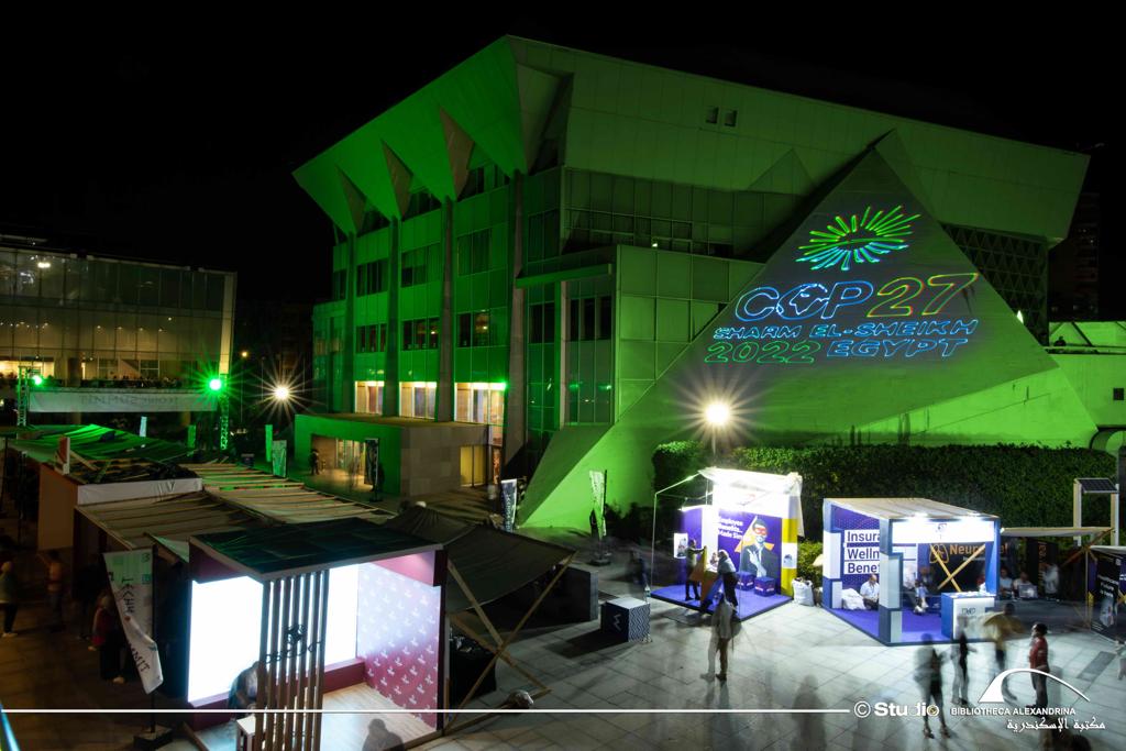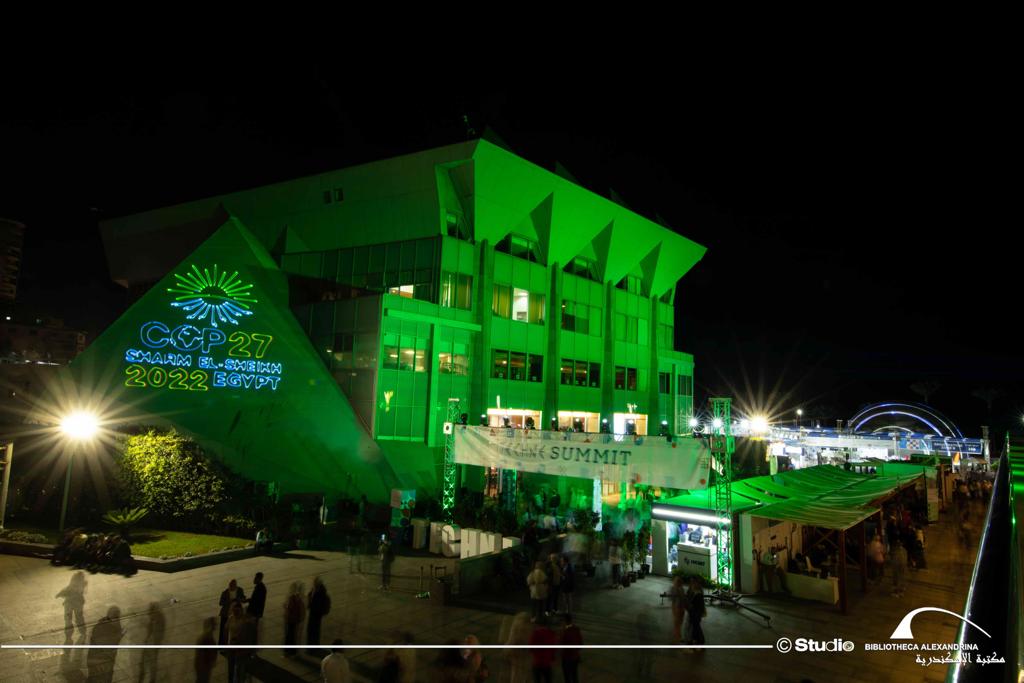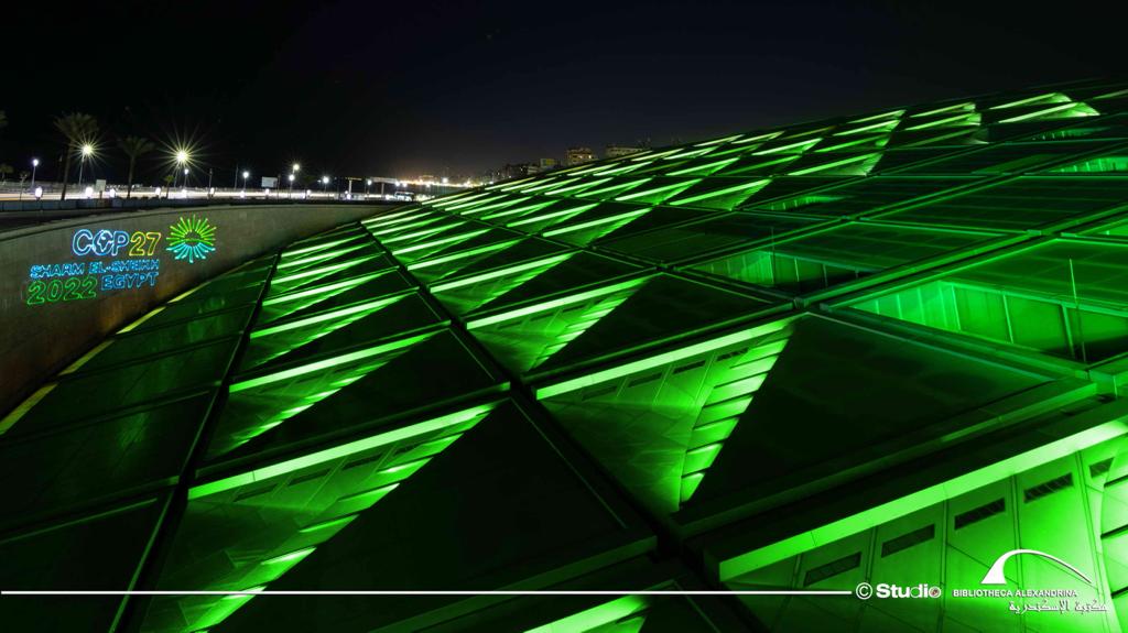 احتفلت مكتبة الإسكندرية اليوم الأحد، بانطلاق فعاليات مؤتمر الأطراف لاتفاقية الأمم المتحدة الإطارية حول تغير المناخ COP27 بشرم الشيخ، والذي سيستمر حتى 18 نوفمبر 2022، وذلك من خلال إضاءة مبنى المكتبة باللون الأخضر وعرض شعار المؤتمر على مبانيها، وهو الشعار الذي أطلقته مصر تزامنا مع استضافتها لهذا الحدث العالمي بحضور زعماء ورؤساء مختلف الدول ووفود رسمية مشاركة من جميع دول العالم.