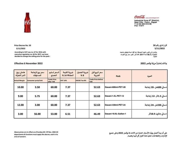 رفعت شركة كوكاكولا، بدءًا من اليوم أسعار عبوات المياه المعدنية داخل الاسواق المحلية وفقا لآخر تحديث للقوائم السعرية