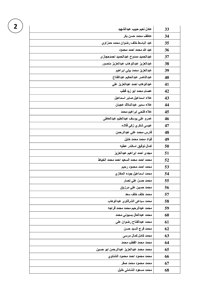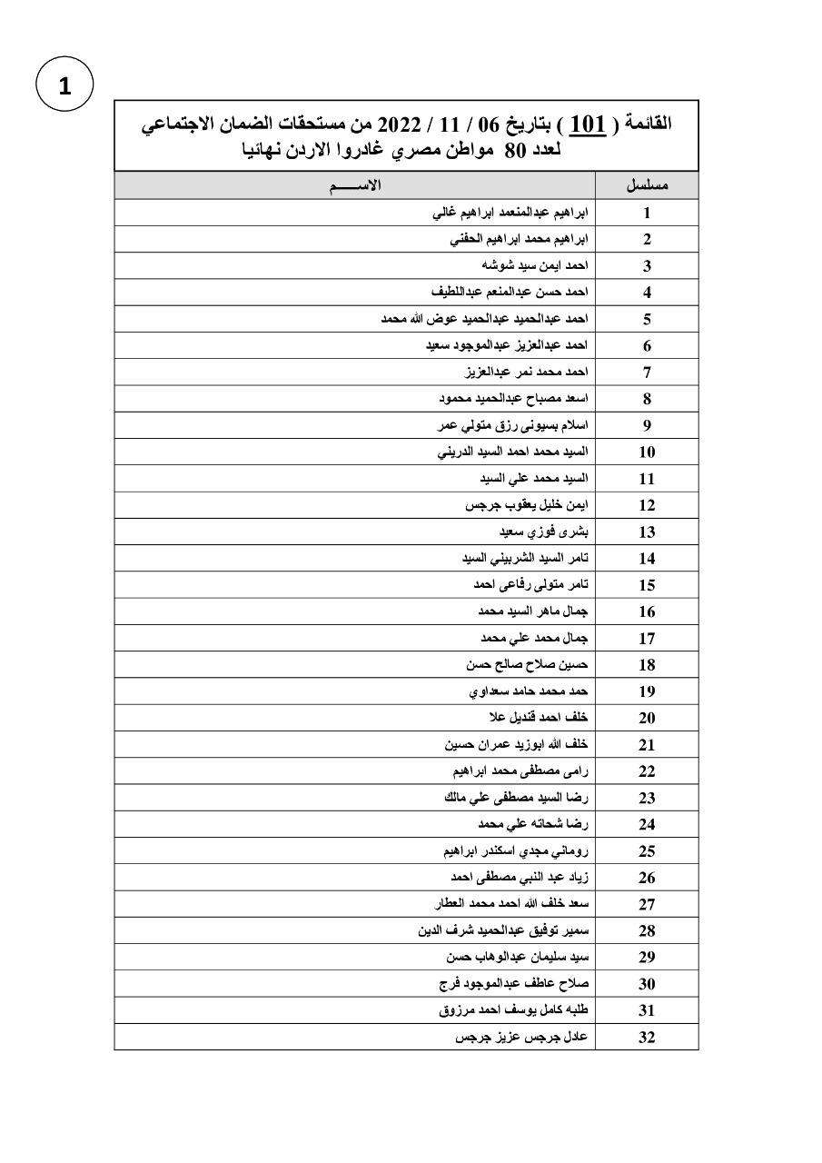 وأضاف الملحق العمالي، أنه طبقا لإجراءات المؤسسة العامة للضمان الاجتماعي بالأردن، سيتم استرجاع المبالغ غير المصروفة بعد مرور 50 يوما من تاريخ الإعلان عن تحويل المستحقات، مشيرا إلى أنه يتم بشكل مستمر التنسيق والتجهيز لإرسال باقي الدفعات لمستحقيها تباعا، فور تدقيقها من الجهات المعنية حفاظا على حقوق المواطنين المستحقين لهذه الدفعات، وتضم القائمة الجديدة الأسماء المرفقة مع هذا البيان: