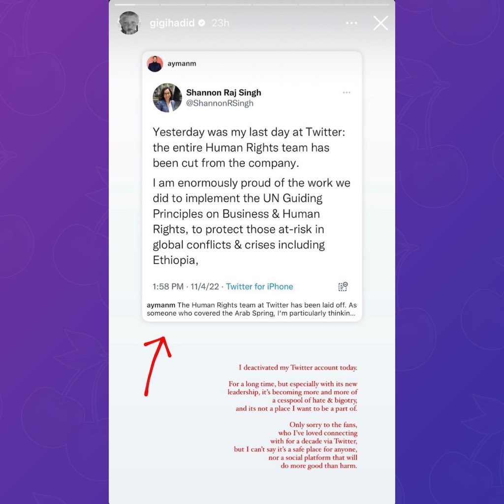 وكتبت جيجي حديد عبر خاصية الأستوري على حسابها بالانستجرام، قائلة: "لقد أصبح تويتر..أكثر فأكثر بؤرة للكراهية والتعصب، وليس المكان الذي أريد أن أكون جزءًا منه.. تويتر لم يعد مكانًا آمنًا لأي شخص، ولا منصة تفيد أكثر من الأذى".