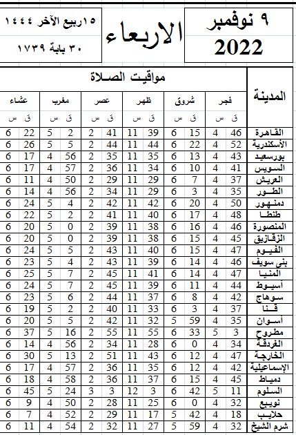 مواقيت الصلاة اليوم وفقًا للتوقيت المحلي لمدينتي القاهرة والإسكندرية وعدد من مدن ومحافظات الجمهورية من واقع بيانات الهيئة العامة للمساحة: