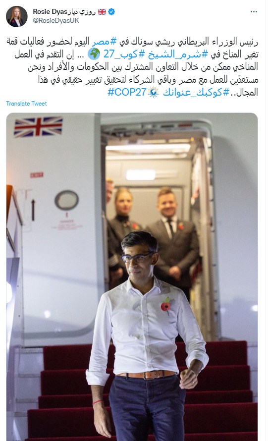 وكتبت روزي دياز تغريدة على تويتر "رئيس الوزراء البريطاني ريشي سوناك في #مصر اليوم لحضور فعاليات قمة تغير المناخ في #شرم_الشيخ #كوب_27 …".