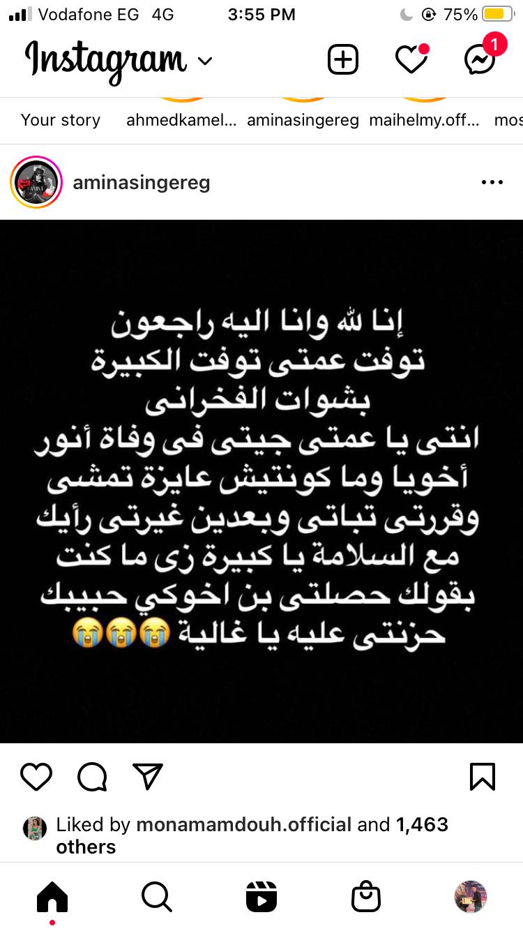 أعلنت المطربة الشعبية أمينة وفاة عمتها وذلك من خلال حسابها الشخصي عبر موقع تبادل الصور والفيديوهات “إنستجرام”.