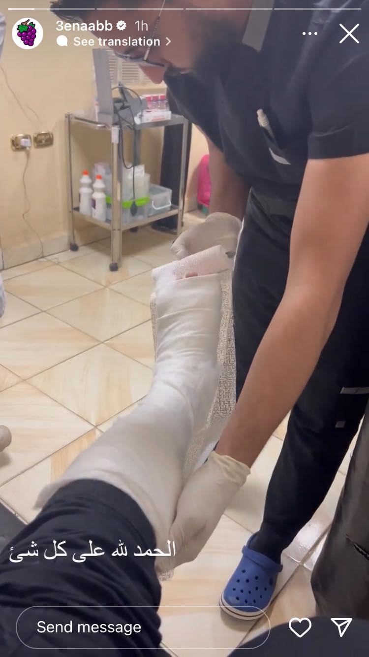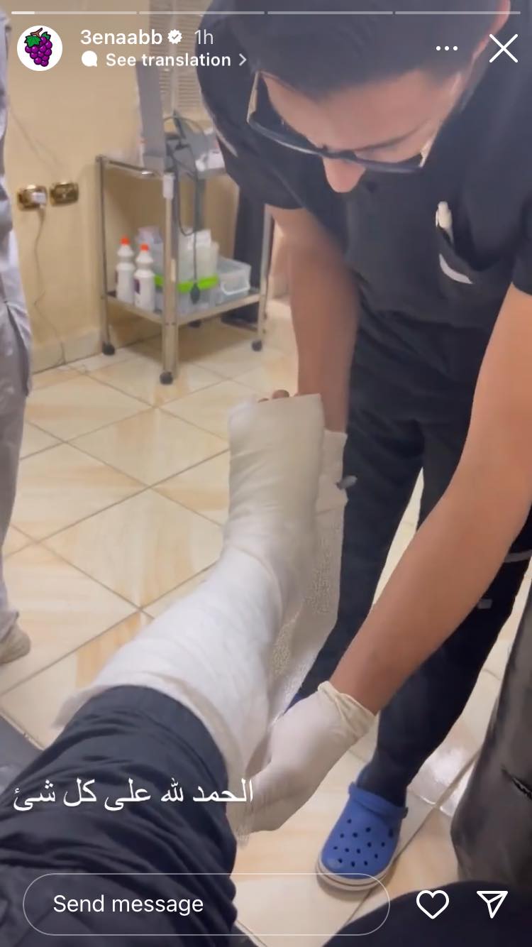 ونشر مطرب المهرجانات عنبة صورته أثناء تركيب “الجبس” على قدمه وعلق قائلًا: “الحمد لله على كل حال”.