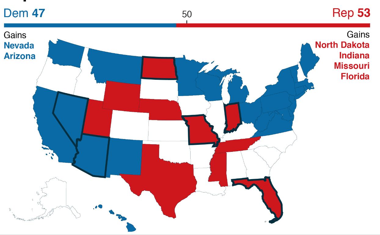 هناك 8 مقاعد في مجلس الشيوخ من المتوقع أن تكون تنافسية، ولكل من الحزبين 4 مقاعد على المحك. مقاعد الجمهوريين في ولايات بنسلفانيا وويسكونسن، وكارولينا الشمالية، وأوهايو، في حين ولايات الديمقراطيين هي أريزونا، وجورجيا، ونيفادا، وكولورادو.