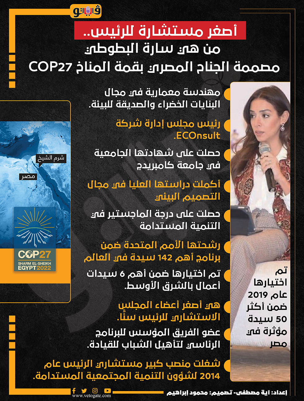 أصغر مستشارة للرئيس.. من هي سارة البطوطي مصممة الجناح المصري بقمة المناخ COP27 | إنفوجراف الإثنين 07/نوفمبر/2022 - 09:19 م 11/7/2022 9:19:50 PM المهندسة سارة البطوطي آية مصطفى شارك طباعة 18 حجم الخط شارك طباعة التنمية المجتمعية COP27 جامعة كامبريدج سارة البطوطي صديقة للبيئة