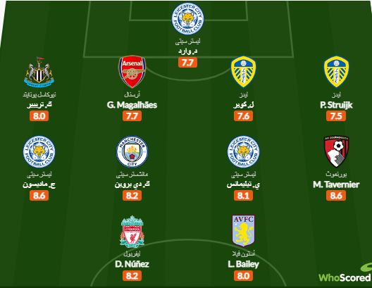 ووفقا لموقع "هوسكورد" المتخصص في الأرقام والإحصائيات، فقد تواجد ليون بايلي وداروين نونيز في هجوم التشكيل المثالي للجولة.