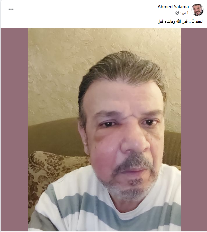 نشر الفنان أحمد سلامة صورةً على صفحته الشخصية بموقع التواصل الاجتماعي "فيس بوك"، يظهر خلالها بوجود كدمة في عينه اليمنى وتورم بالخد بنفس الجهة.