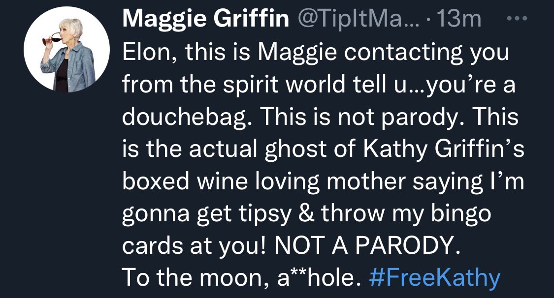 واستخدمت كاثي جريفيت حساب والدتها المتوفاة “ماجي جريفين”، لنشر تغريدة تهاجم، فيها الملياردير إيلون ماسك، وتصفه بالغبي والأخرق، موضحة أن من يغرد من الحساب هو شبح والدتها المتوفاة.