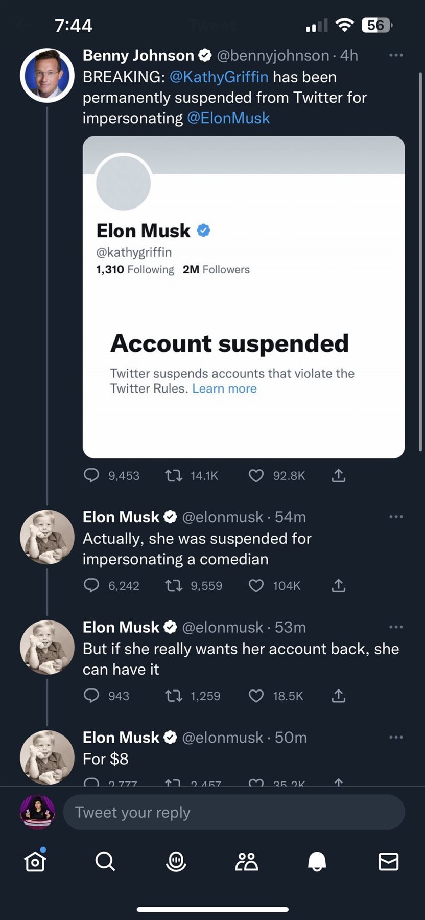 وتعود البداية عندما غيرت الممثلة الكوميدية كاثي جريفين 62 عاما، اسم ملفها الشخصي إلى Musk، فيما ظل اسمها صحيحا على اسم المستخدم @kathygriffin، ليظهر اللقب وبجانبه علامة التوثيق الزرقاء باسم "Elon Musk"، وهو ما يتعارض مع سياسة الشركة ضد انتحال الهوية، وهو ما دفع إيلون ماسك لحظر حسابها على تويتر للأبد.