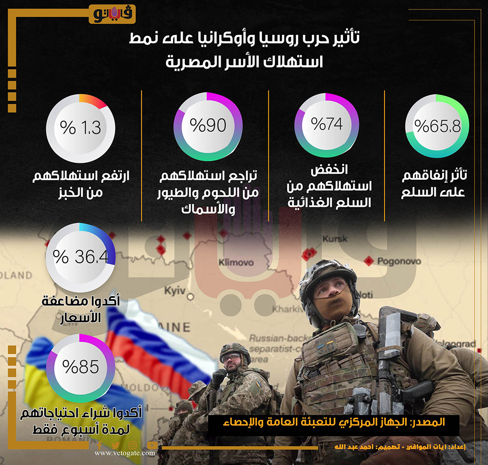 تأثير حرب روسيا وأوكرانيا على نمط استهلاك الأسر المصرية | إنفوجراف الأربعاء 09/نوفمبر/2022 - 07:59 م 11/9/2022 7:59:47 PM حرب روسيا وأوكرانيا آيات الموافى شارك طباعة 18 حجم الخط شارك طباعة استهلاك الغذائية للتعبئة والإحصــاء العامة