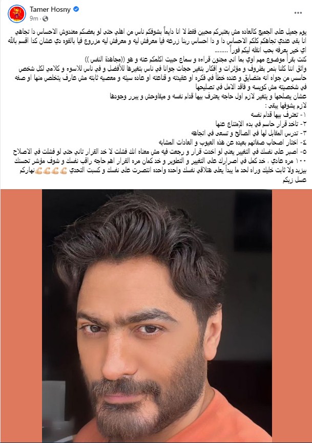 وقال "كنت بقرأ موضوع مهم اوي بما إني مجنون قراءة وسماع حبيت اكلمكم عنه وهو (مجاهدة النفس).. واثق إننا كلنا بنمر بظروف ومؤثرات وأفكار بتغير حاجات جوانا في ناس بتغيرها للأفضل وفي ناس للأسوأ وكلامي لكل شخص حاسس من جواه إنه متضايق وعنده خطأ في فكره أو عقيدته وقناعته أو عادة سيئة ومعصية ثابتة مش عارف يتخلص منها او صفة في شخصيته مش كويسة وفاقد الأمل في تصليحها".