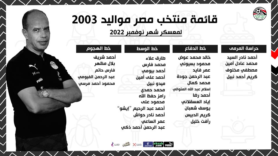 أعلن الجهاز الفني لمنتخب الشباب مواليد 2003 بقيادة محمود جابر، قائمة اللاعبين المنضمين لمعسكر الفريق، خلال الأجندة الدولية لشهر نوفمبر الجاري
