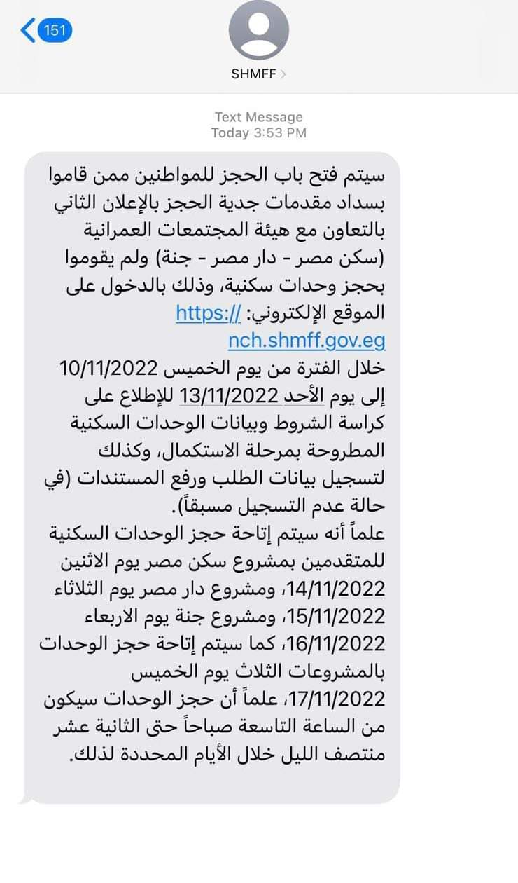 وأخطر الصندوق المواطنين - فى رسائل نصية-للمتقدمين بسداد مقدمات جدية الحجز ولم يقوموا بحجز وحدات سكنية بإعادة فتح باب الحجز عبر الموقع الالكتروني للصندوق خلال الفترة من الخميس المقبل 10 - حتى الاحد 13 نوفمبر الجاري وذلك للاطلاع على كراسة الشروط وبيانات الشقق المطروحة وتسجيل البيانات ورفع المستندات فى حالة عدم التسجيل.