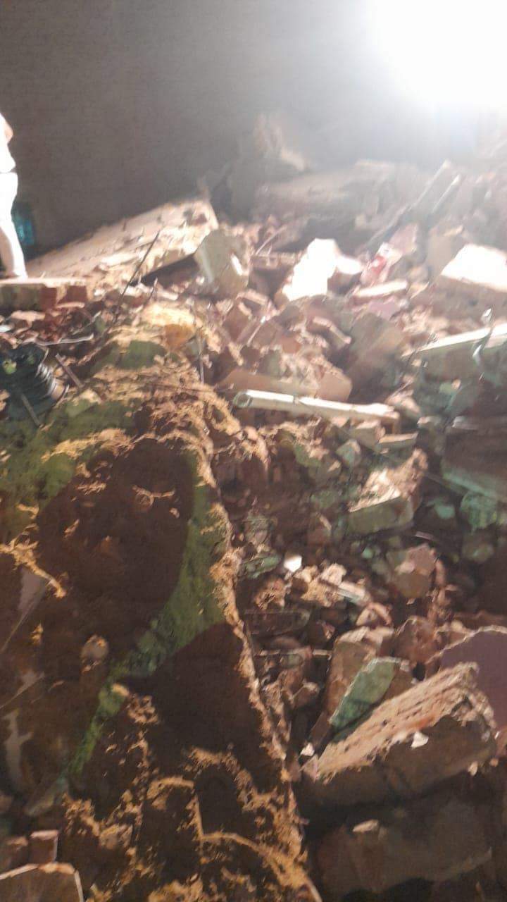 وبالفحص تبين وقوع انهيار بالمنزل المكون من دور أرضى و3 طوابق وتم فرض طوق أمني لمنع الاقتراب منه خشية انهيار أي منازل أخرى في أي لحظة، وجار البحث عن أي أشخاص.