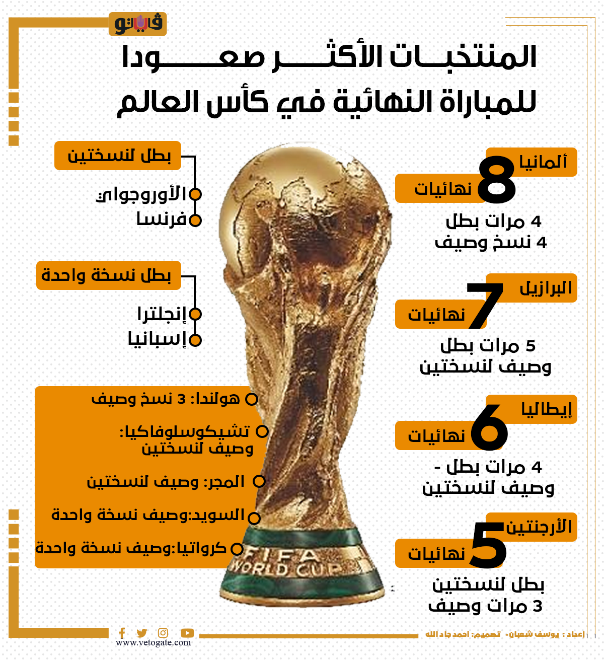 المنتخبات الأكثر صعودا للمباراة النهائية في كأس العالم| إنفوجراف الأربعاء 09/نوفمبر/2022 - 12:07 م 11/9/2022 12:07:45 PM منتخب ألمانيا الأكثر مشاركة في نهائي كأس العالم يوسف شعبان شارك طباعة 18 حجم الخط شارك طباعة كأس العالم كأس العالم 2022 بقطر أخبار بطولة كاس العالم 2022 بقطر منتخب ألمانيا منتخب البرازيل