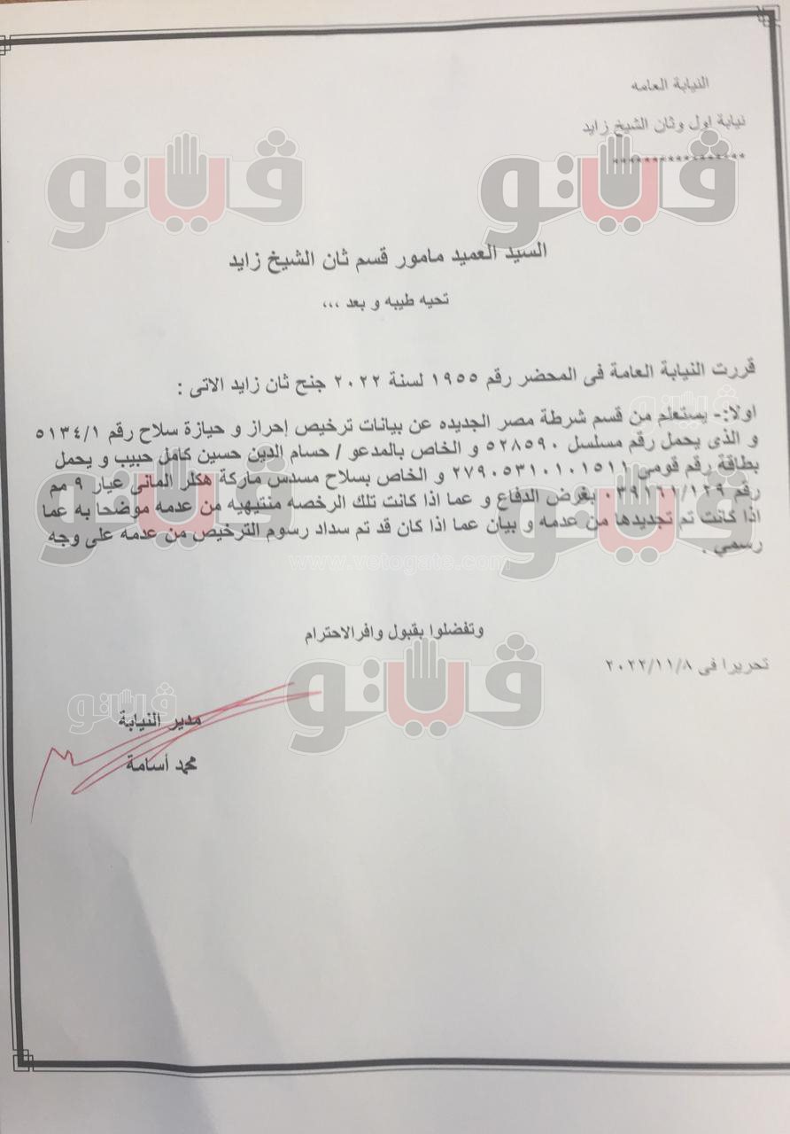 وحصلت "فيتو" على صورة من طلب نيابة الشيخ زايد، من وزارة الداخلية ممثلة فى مأمور قسم ثان الشيخ زايد الاستعلام عن ترخيص السلاح الشخصي الذي يستخدمه حسام حبيب.
