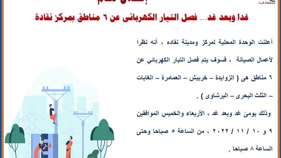 أعلنت شركة الكهرباء بمدينة نقادة جنوب محافظة قنا عن فصل التيار الكهربائي بسبب أعمال الصيانة عن ٦ مناطق.
