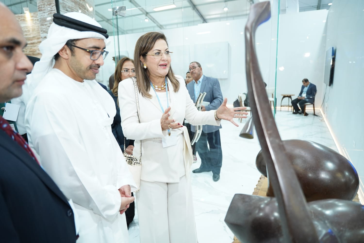 وخلال اللقاء حرصت وزيرة التخطيط والتنمية الاقتصادية على اصطحاب وزير خارجية الامارات في جولة تفقدية للجناح المصري، واستعراض القطع الفنية المعروضة بالجناح وعلاقتها بقضايا المناخ وتعبيرها عن الثقافة المصرية.