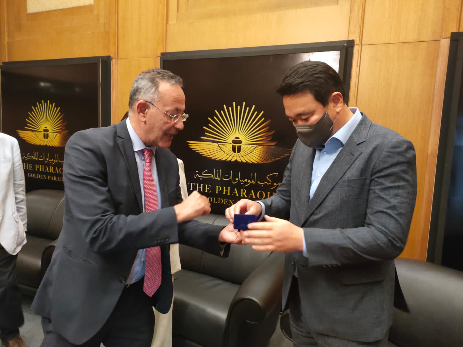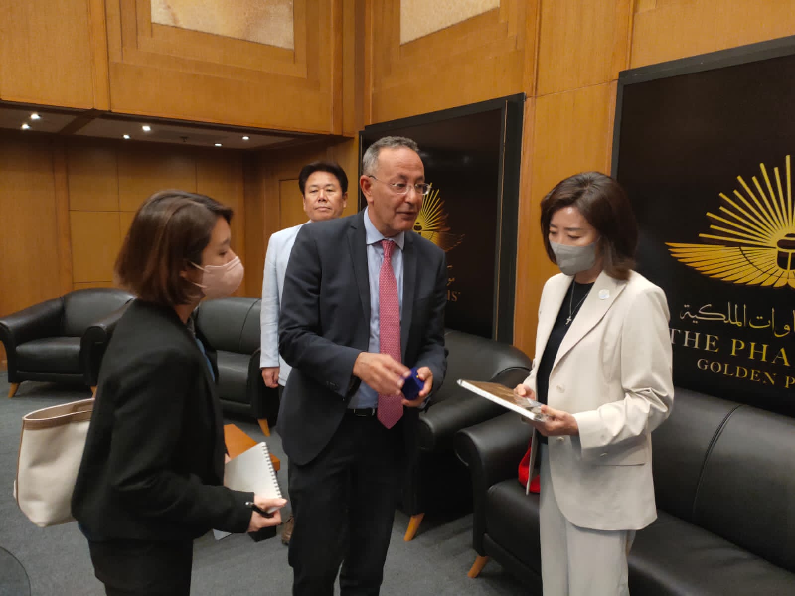 وحرص الدكتور أحمد غنيم رئيس هيئة المتحف القومي للحضارة المصرية، على استقبال المبعوث الخاص لرئيس الجمهورية الكورية والوفد المرافق له بقاعة كبار الزوار، حيث رحب بهم، وقدم لهم الهدايا التذكارية، وعرفهم بالمتحف وفكرة وتاريخ إنشائه، ودوره كأحد المقاصد السياحية والأثرية الهامة ومنارة ثقافية وعلمية متميزة.
