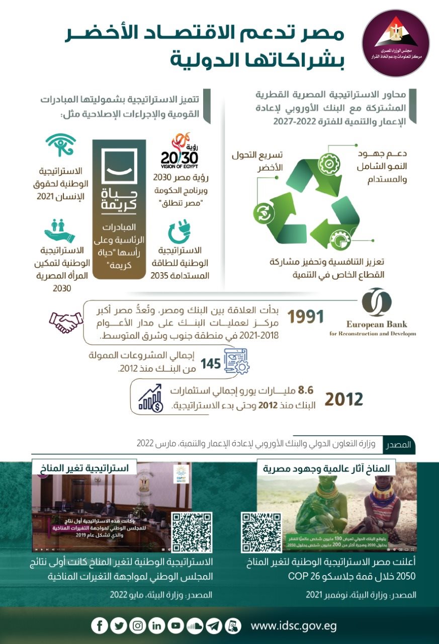 نشر مركز المعلومات ودعم اتخاذ القرار بمجلس الوزراء إنفوجرافيك بعنوان "مصر تدعم الاقتصاد الأخضر بشراكاتها الدولية".