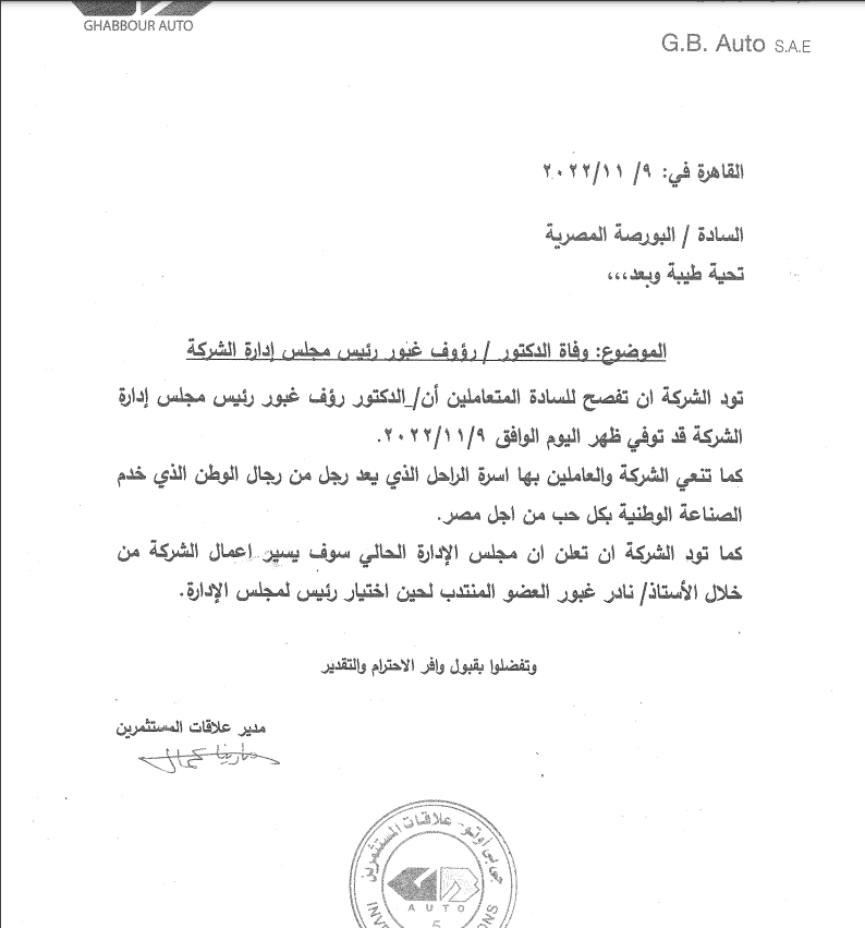 أصدرت شركة جى بى اوتو بيان بشأن وفاة المهندس رؤوف كمال غبور رئيس مجلس إدارة الشركة اليوم،