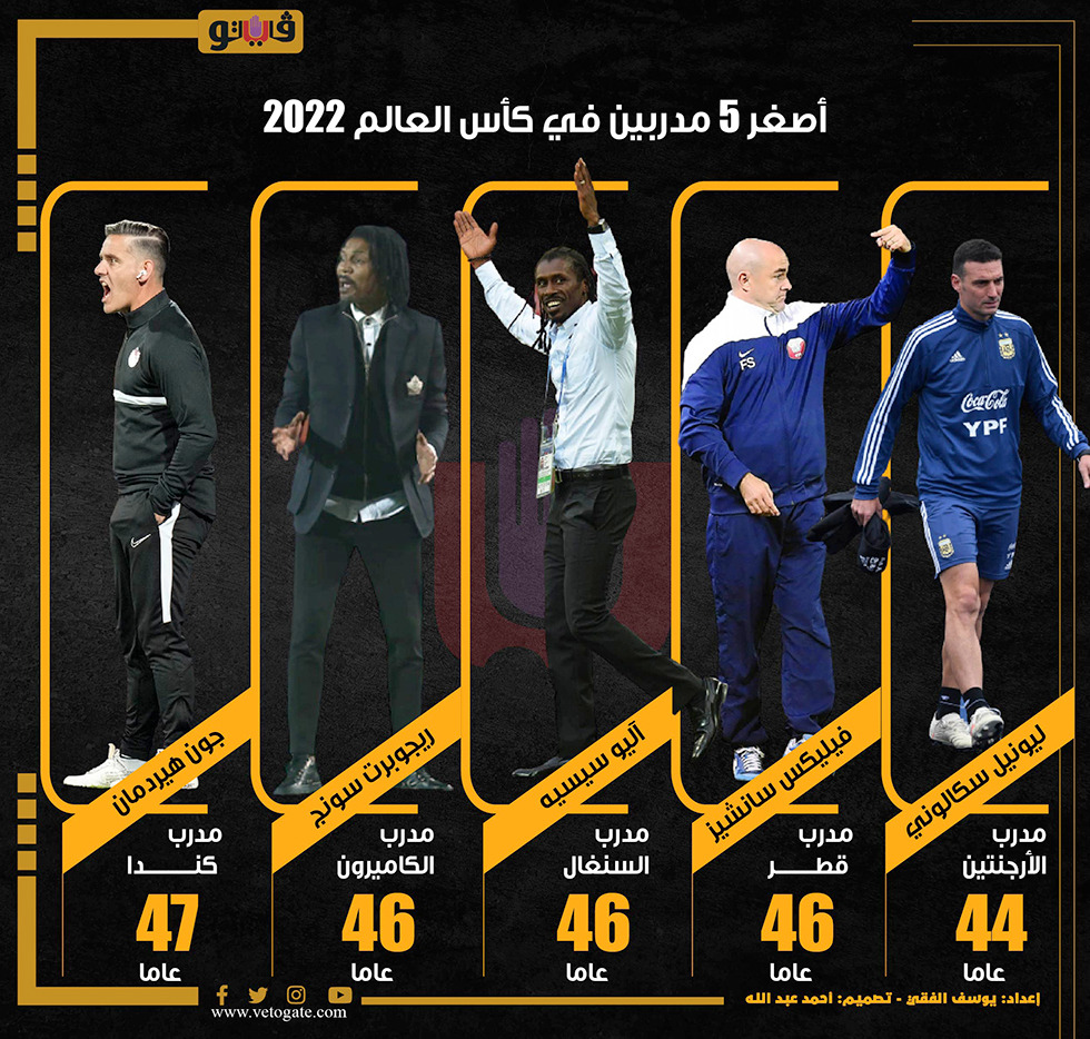 أصغر 5 مدربين في كأس العالم 2022 | انفوجراف الأربعاء 09/نوفمبر/2022 - 07:51 م 11/9/2022 7:51:08 PM اليو سيسيه مدرب السنغال يوسف الفقي شارك طباعة 18 حجم الخط شارك طباعة كأس العالم كأس العالم 2022 مونديال قطر أخبار كأس العالم أليو سيسيه