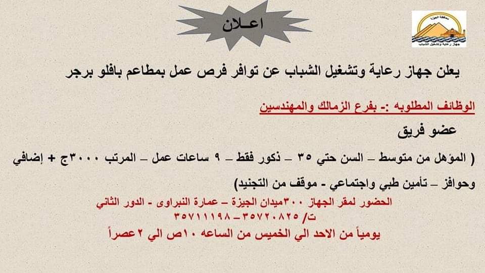 أعلن جهاز تشغيل الشباب بمحافظة الجيزة توفير فرص عمل بمطاعم بافلو برجر، موضحًا أن الوظيفة المطلوبة هي عضو فريق بمطاعم المهندسين والزمالك.