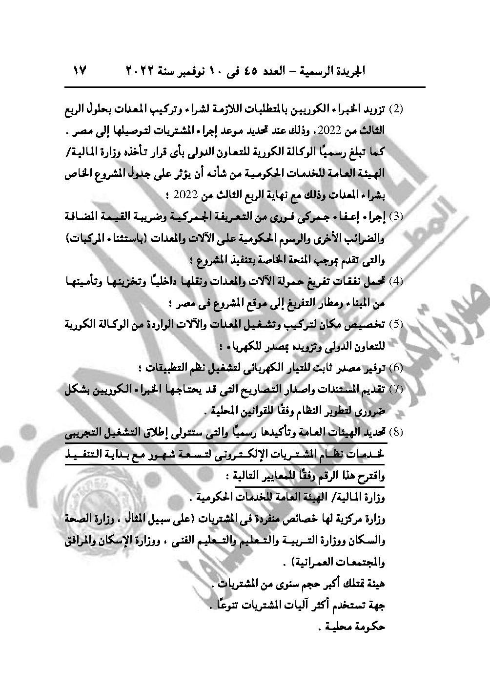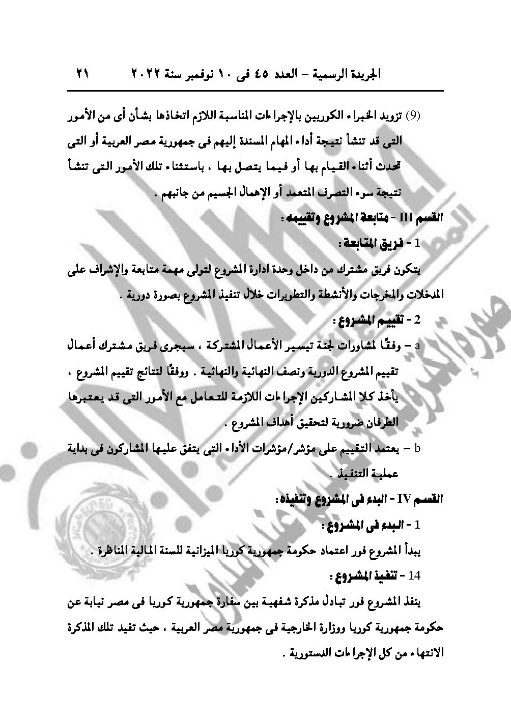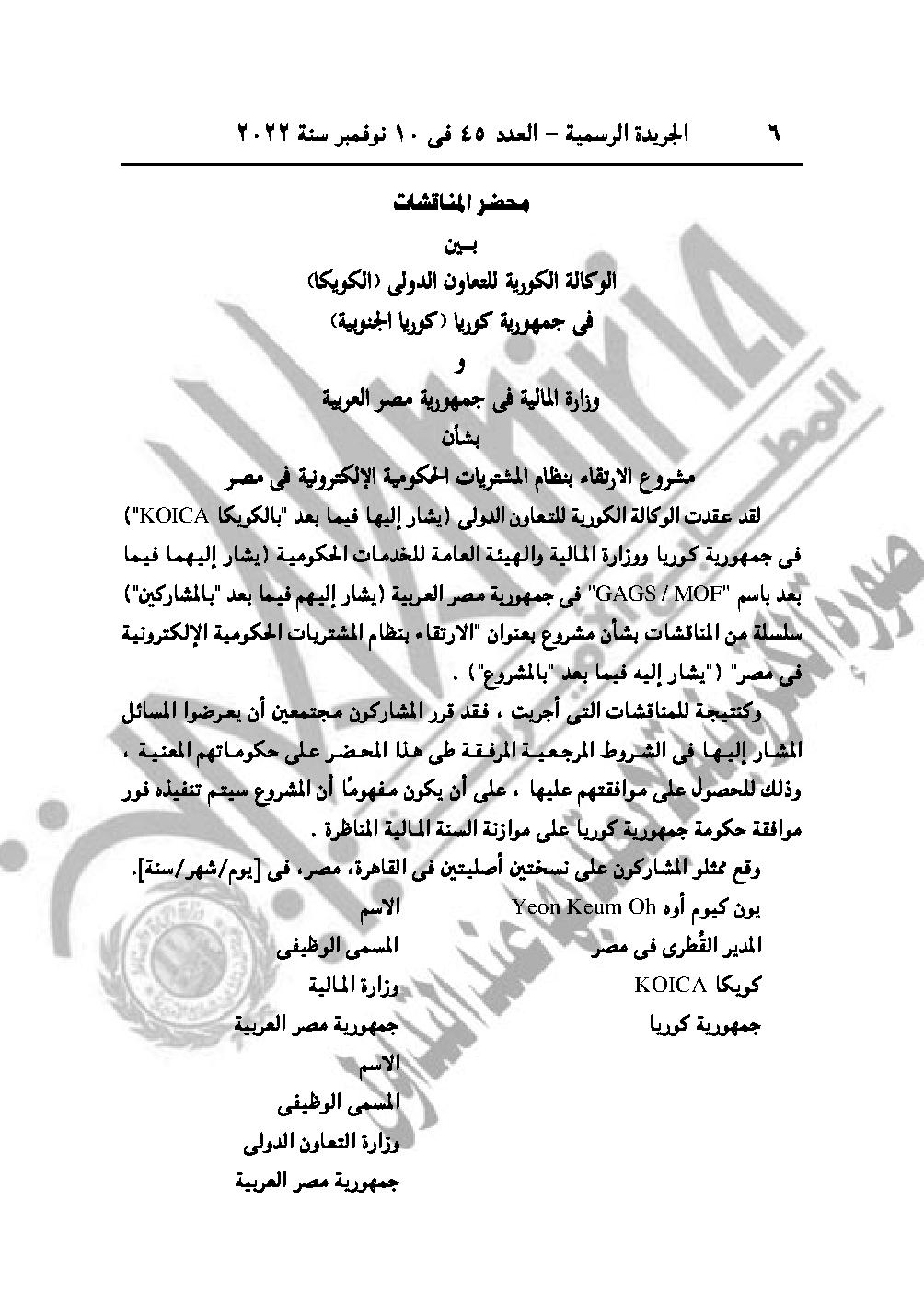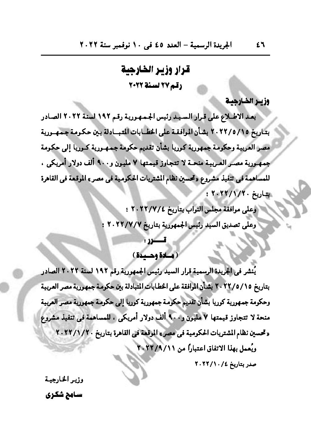 -قرار رئيس الجمهورية رقم 192 لسنة 2022، بشأن الموافقة على الخطابات المتبادلة بين حكومة جمهورية مصر وحكومة جمهورية كوريا بشأن تقديم حكومة كوريا إلى حكومة مصر منحة لا تتجاوز قيمتها 7 مليون و900 ألف دولار أمريكي للمساهمة في تنفيذ مشروع "تحسين نظام المشتريات الحكومية في مصر"
