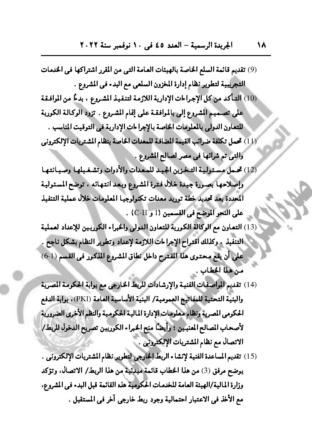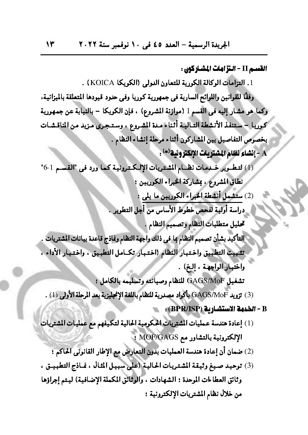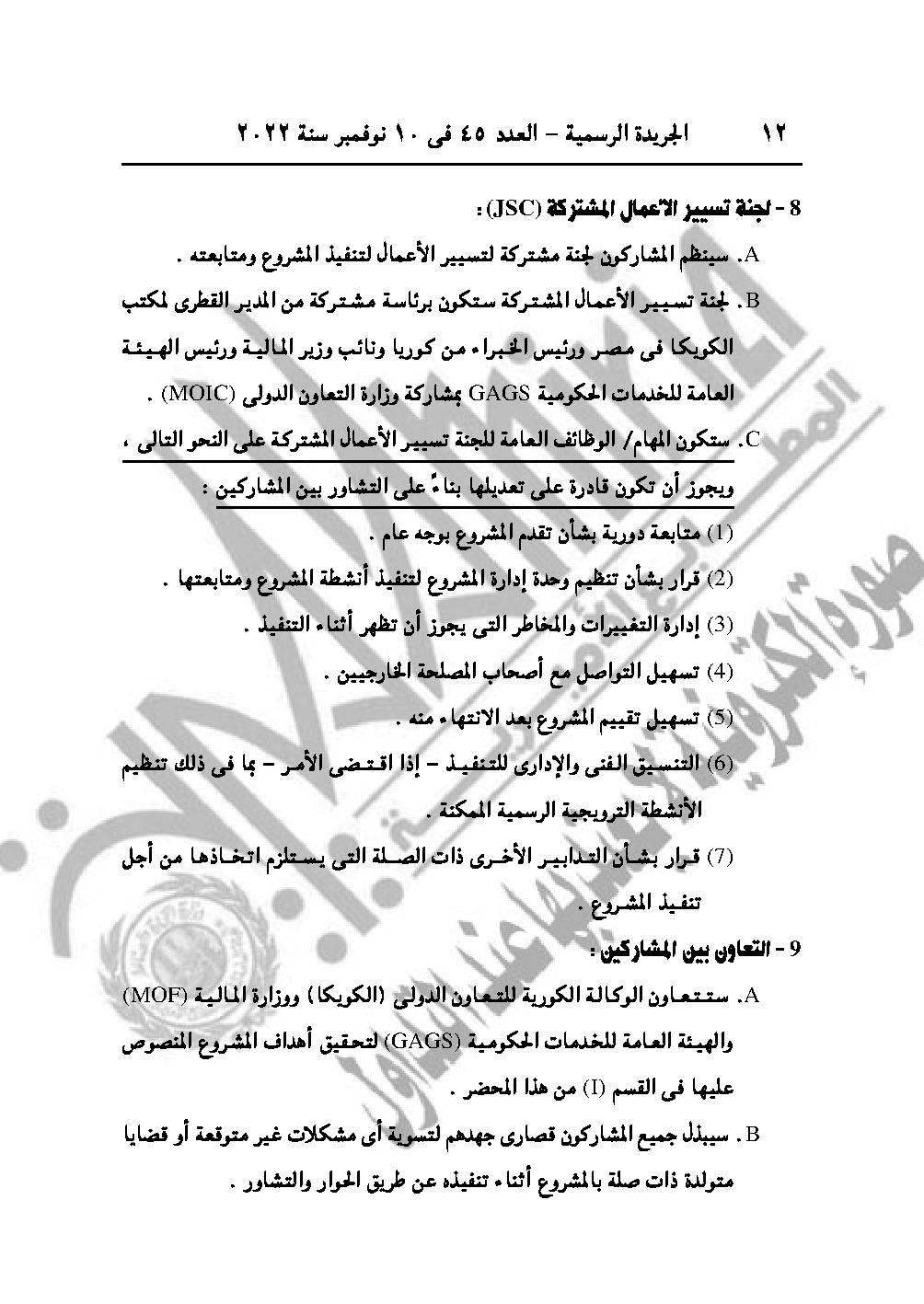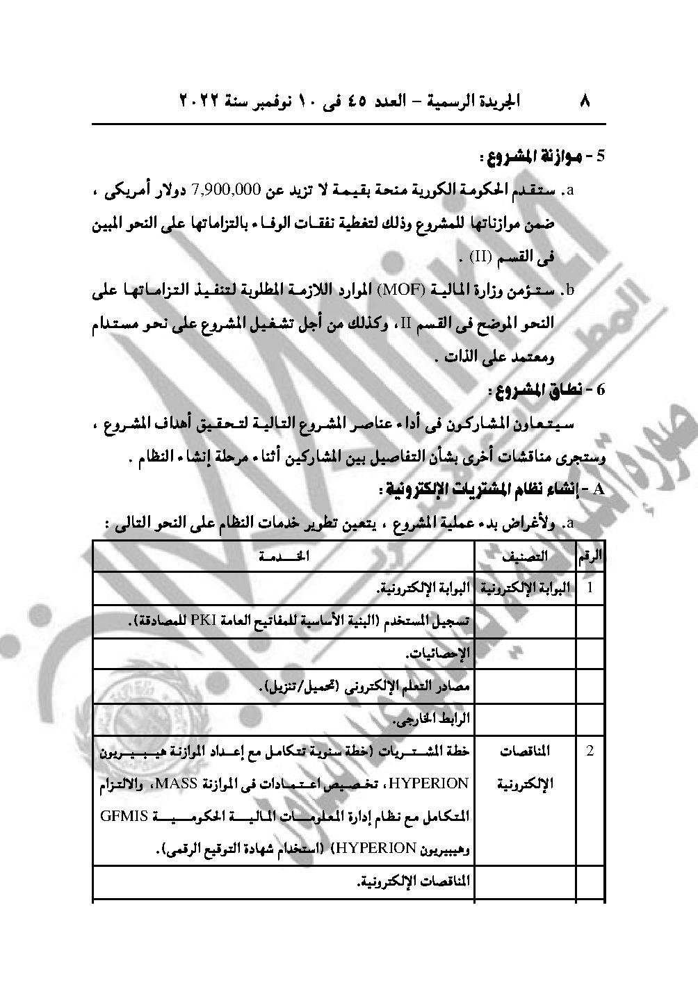 -قرار رئيس الجمهورية رقم 192 لسنة 2022، بشأن الموافقة على الخطابات المتبادلة بين حكومة جمهورية مصر وحكومة جمهورية كوريا بشأن تقديم حكومة كوريا إلى حكومة مصر منحة لا تتجاوز قيمتها 7 مليون و900 ألف دولار أمريكي للمساهمة في تنفيذ مشروع "تحسين نظام المشتريات الحكومية في مصر"