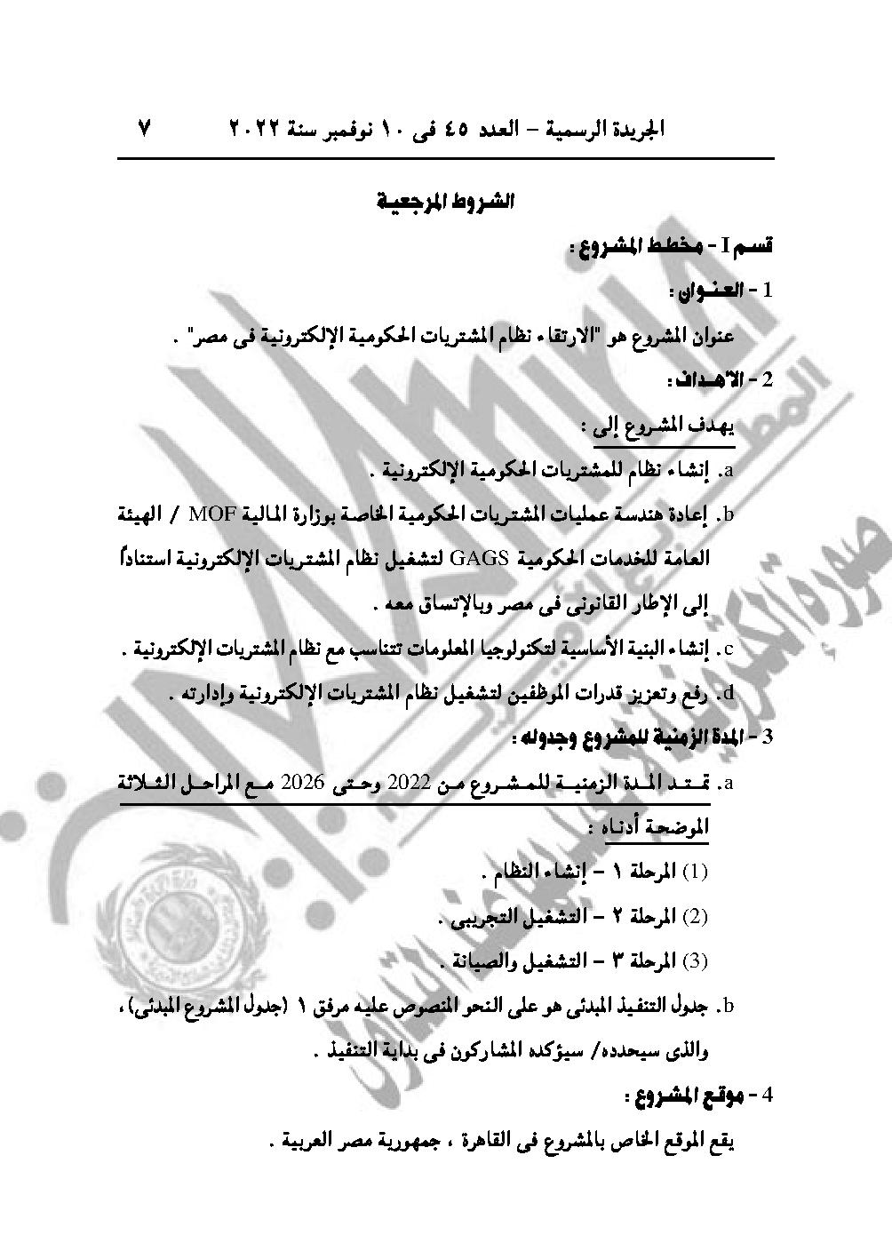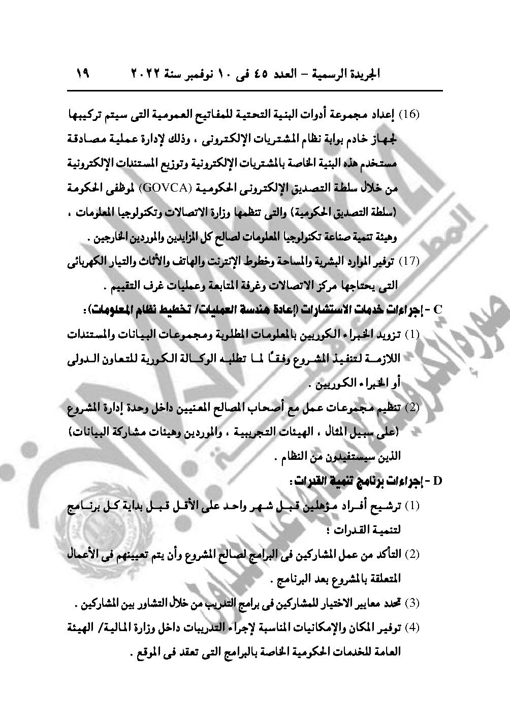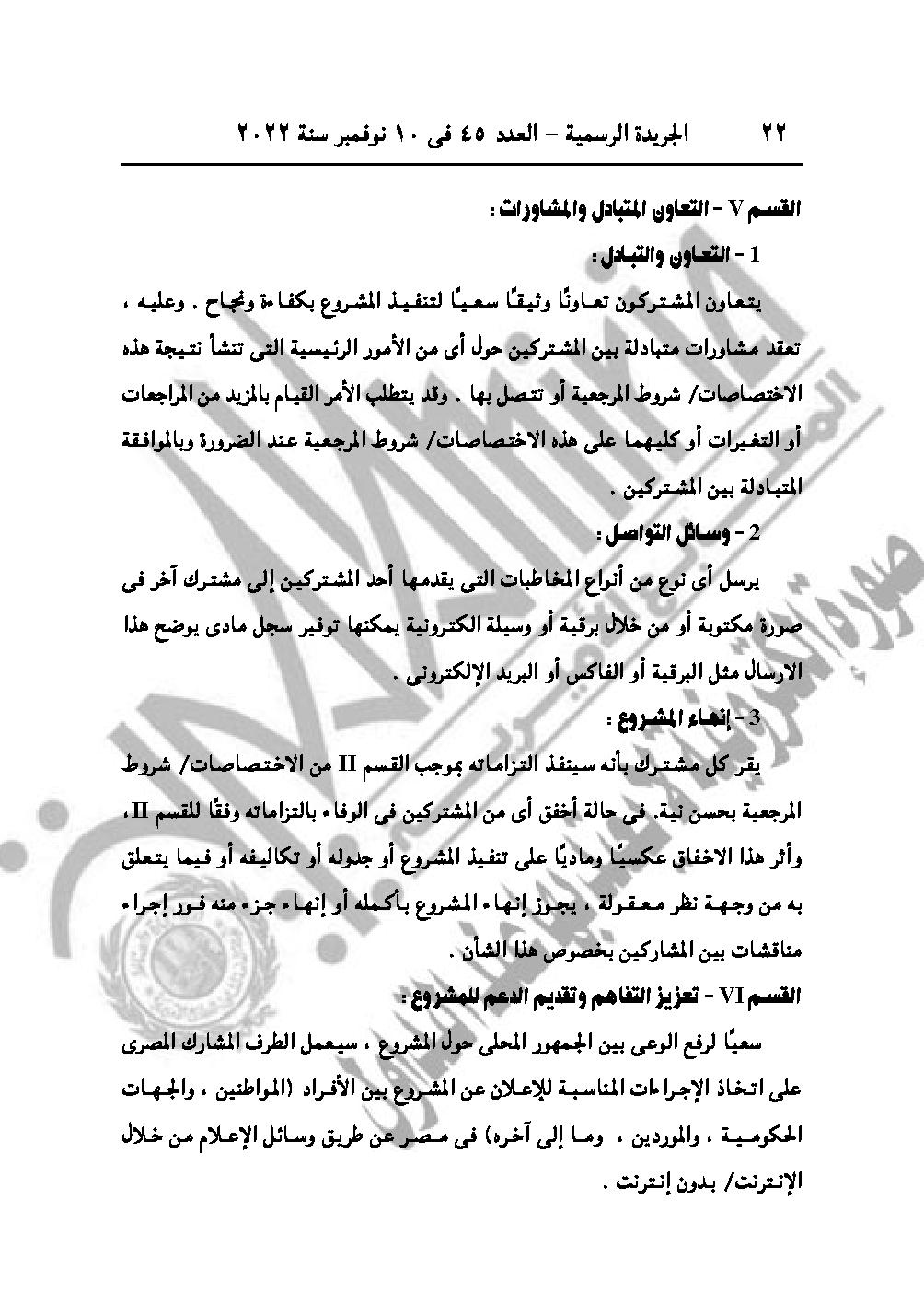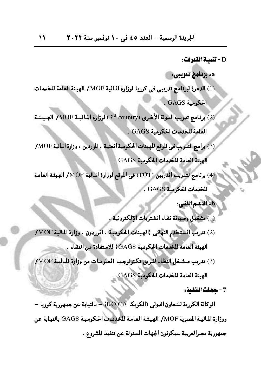 -قرار رئيس الجمهورية رقم 192 لسنة 2022، بشأن الموافقة على الخطابات المتبادلة بين حكومة جمهورية مصر وحكومة جمهورية كوريا بشأن تقديم حكومة كوريا إلى حكومة مصر منحة لا تتجاوز قيمتها 7 مليون و900 ألف دولار أمريكي للمساهمة في تنفيذ مشروع "تحسين نظام المشتريات الحكومية في مصر"